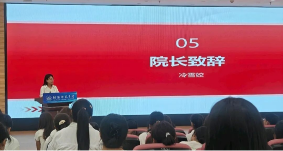 为让新生感受学前教育专业的温度,学院特别播放了来自小朋友们的加油视频,纯真的鼓励为新生注入守护童心的力量。随后,冷雪姣副院长上台致辞,深入解读学前教育专业的价值与意义,与新同学们共话初心与梦想、求索与成长、使命与远方;康鑫鑫副书记则围绕即将开启的军训展开动员,鼓励新生以坚韧意志迎接大学首次历练,号召同学们向下沉淀,向上生长,筑牢青春成长的坚实根基。典礼现场还播放了新生家长的暖心寄语视频,父母的叮嘱与期待让在场新生倍感温暖。
